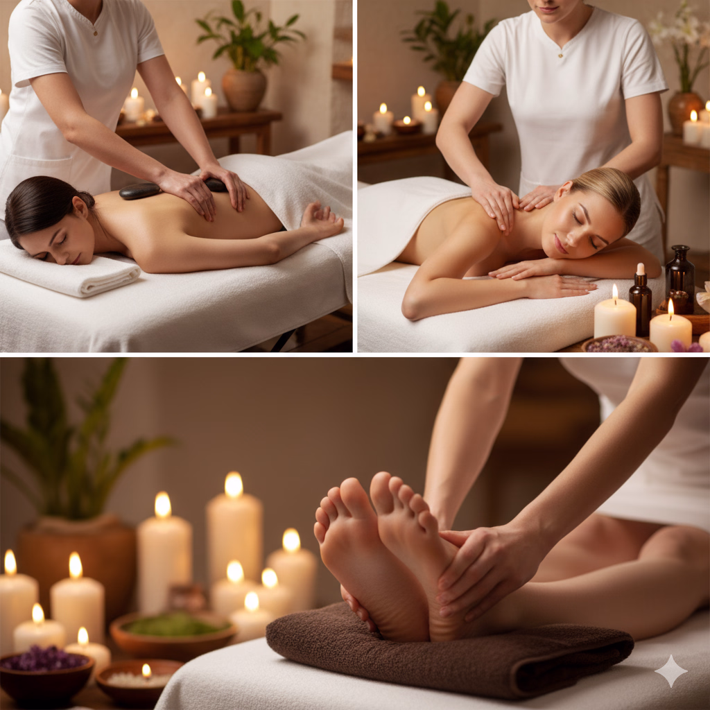 Different massage styles targeting stress release. Swedish massage is gentler; deep tissue works into deeper muscle layers; reflexology focuses on pressure points, especially on feet or hands.