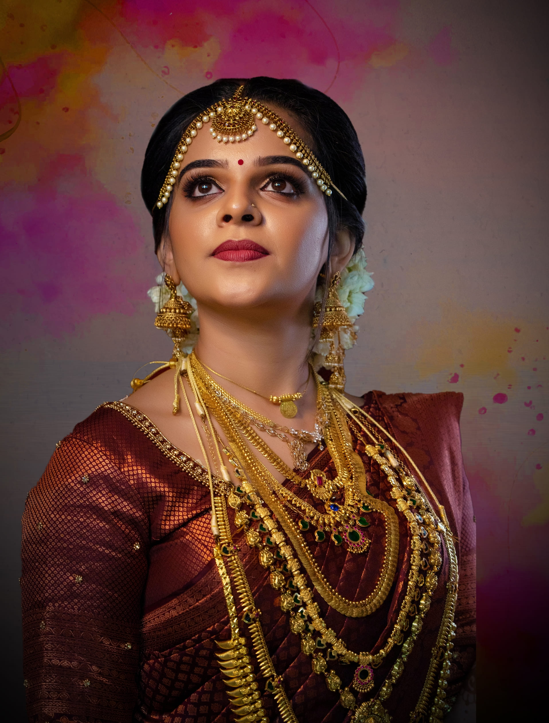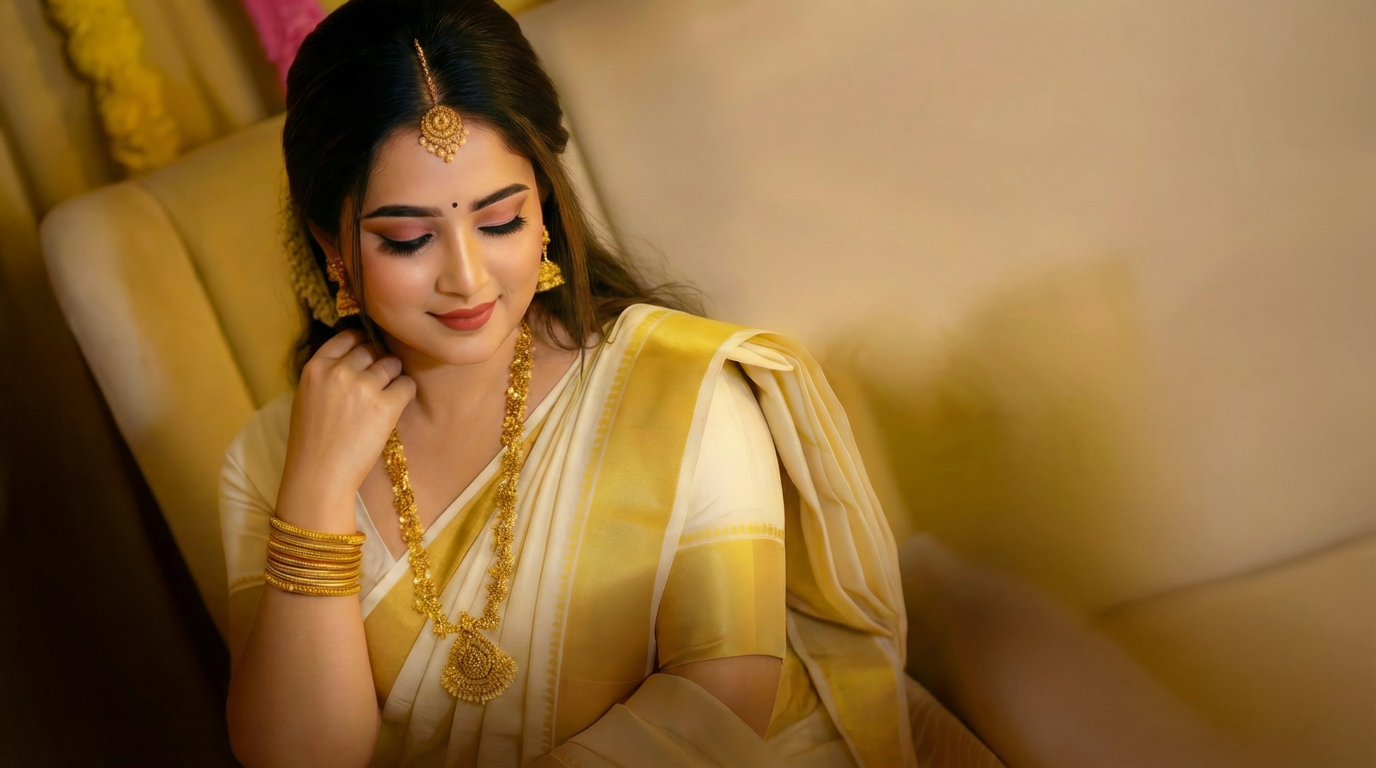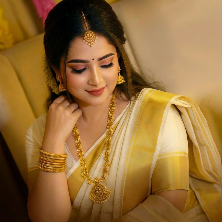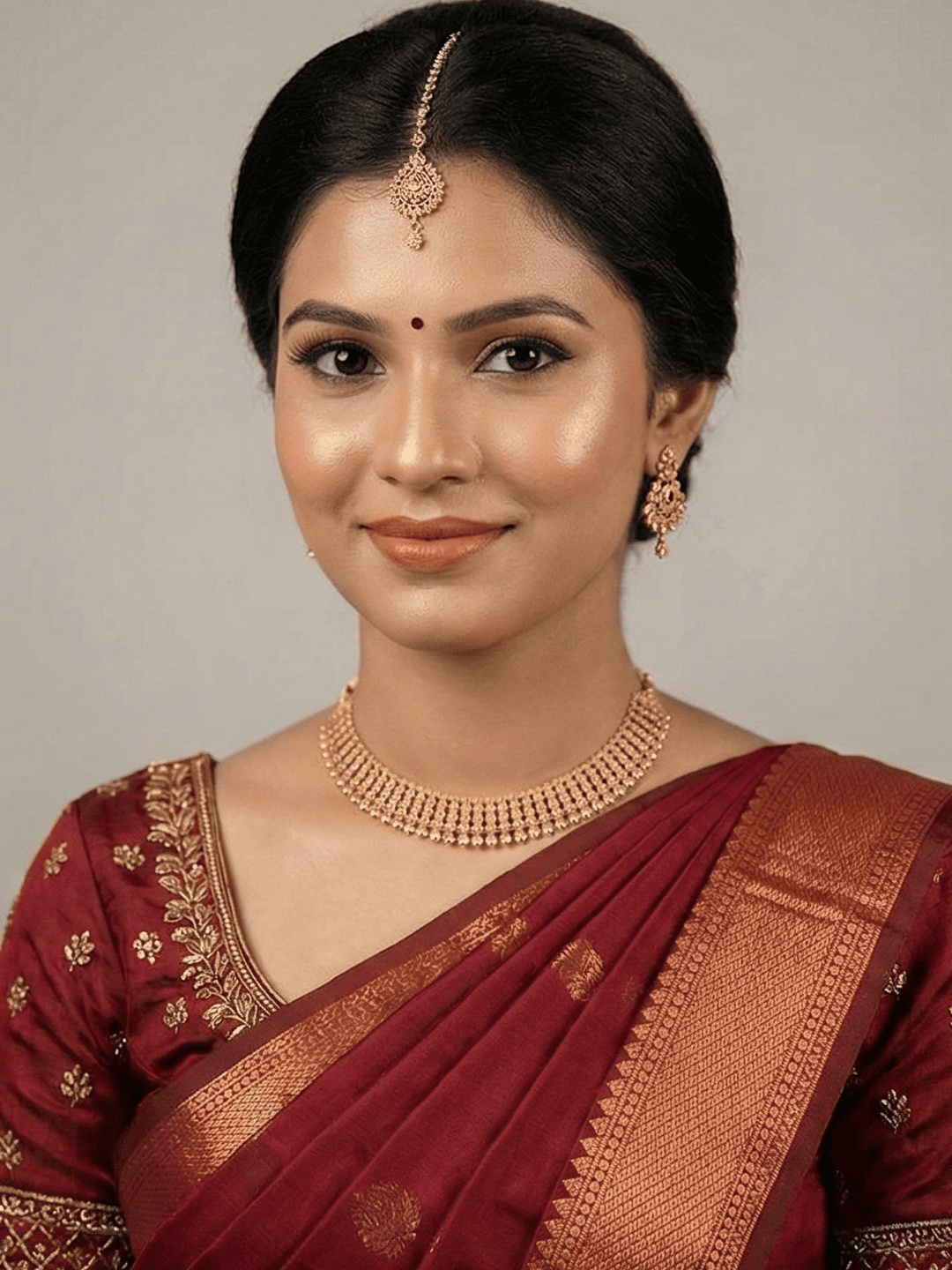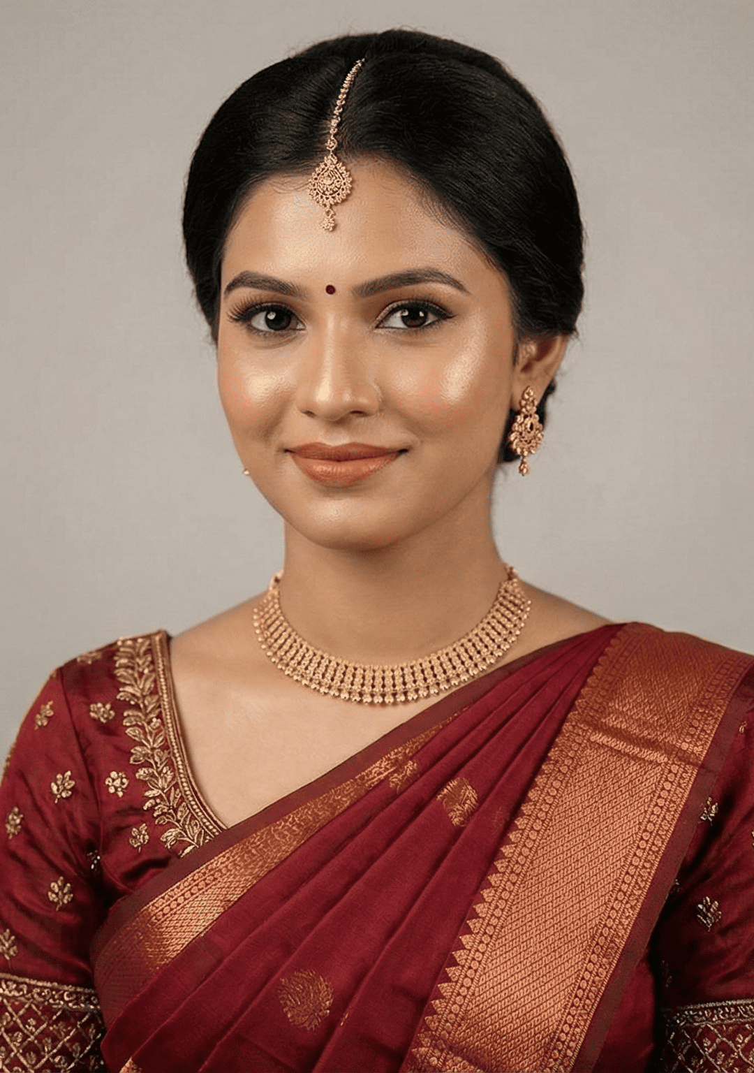 Our traditional Kerala bridal makeup focuses on enhancing natural features while respecting cultural aesthetics. Ideal for muhurtham and temple weddings, this look highlights radiant skin, expressive eyes, and graceful elegance that complements traditional sarees and gold jewelry.