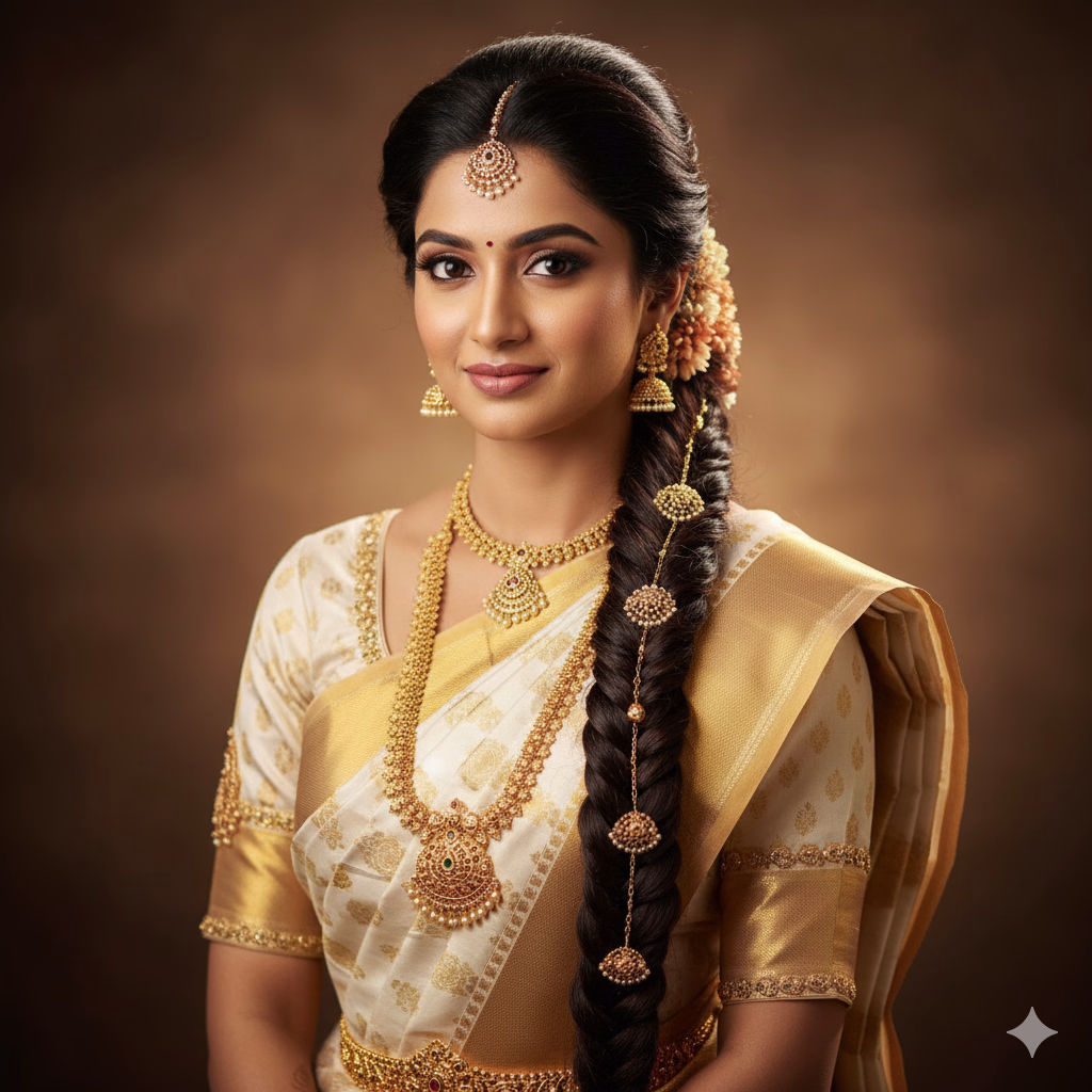 One cannot talk about Kerala bridal hair without giving the classic its due. A sleek bun or long braid wrapped in fresh jasmine (mulla mala) remains a beloved staple. The fragrant white flowers, gold accessories and rich silk saree set a distinctly Kerala mood.