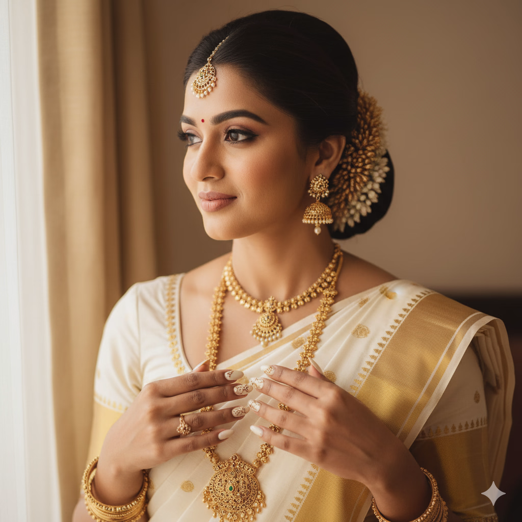 - Colour palette: If the bride is wearing the classic white+gold “kasavu” saree, picking nails in cream/gold or soft rose makes sense. If the saree has more vibrant colours (emerald, maroon), nails could pick up the accent colour.